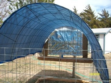 Then we attached a tarp to the top of the structure for shade. I attached this with zip ties. Then we attached a light weight bird netting that covered all areas of the cattle panels to prevent the birds from getting out and predators from getting in. I later decided it is too light weight but will add chicken wire to the front door panel later.